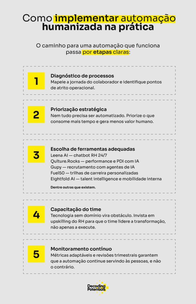 Automação não existe para substituir conversas, feedbacks ou decisões humanas. Existe para eliminar o trabalho que consome tempo sem gerar valor: preenchimento de planilhas, envio manual de comunicados, triagem inicial de currículos, controle de prazos.