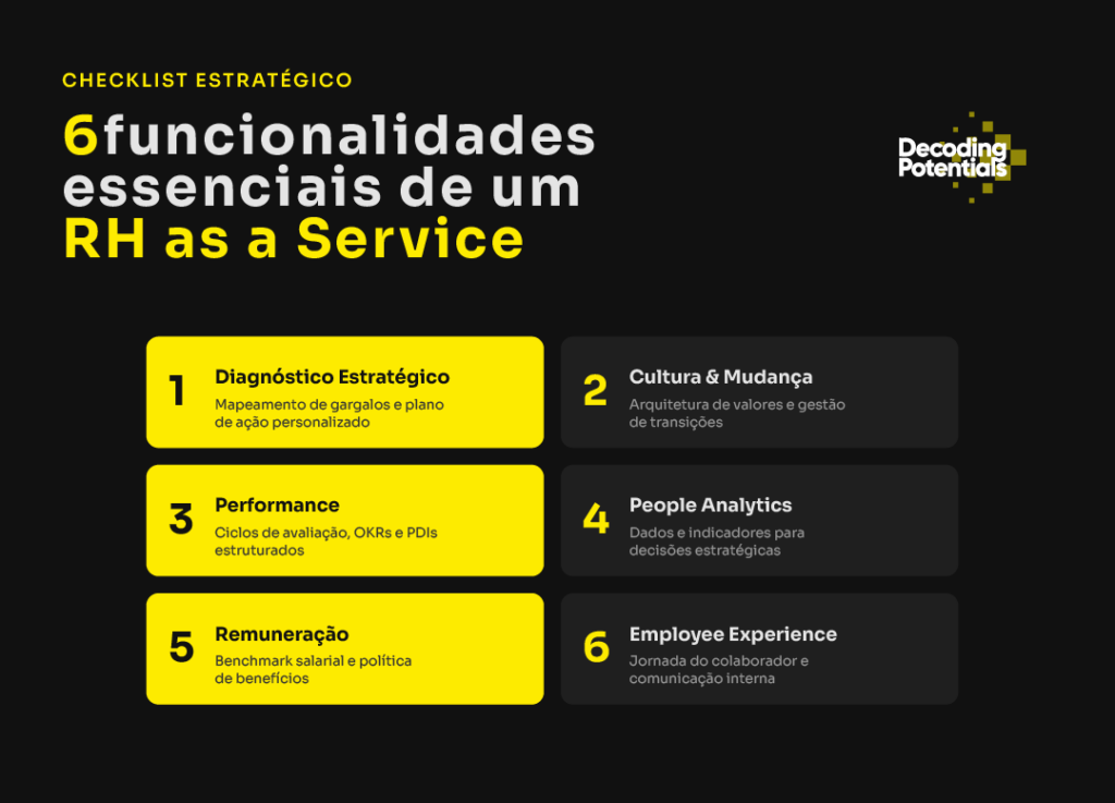 Na Decoding Potentials, trabalhamos com essa visão integrada. Nossa solução de RH as a Service foi desenhada para empresas que precisam de resultados mensuráveis, redução de turnover, aumento de engajamento, fortalecimento de cultura, sem abrir mão da agilidade que o momento exige.