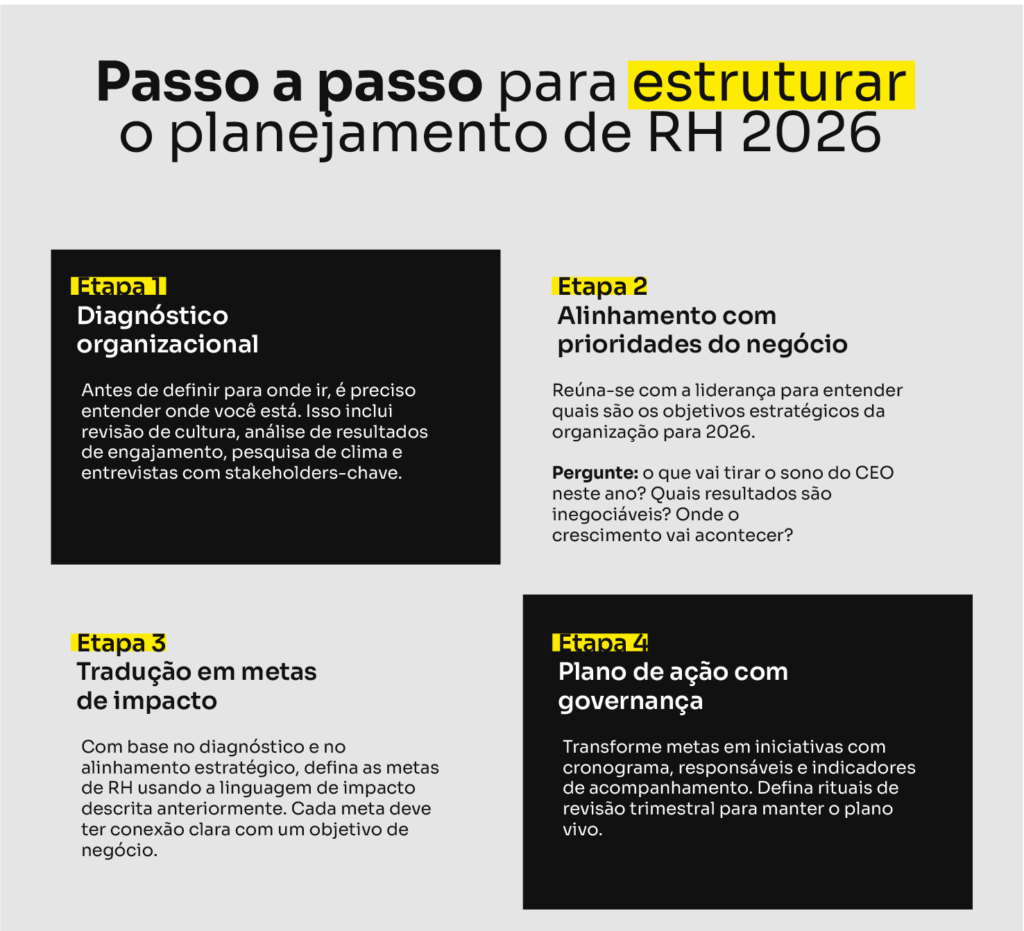 Metas bem estruturadas são o primeiro passo. Elas sinalizam para a organização que o RH entende o negócio, fala a linguagem do board e está comprometido com resultados mensuráveis.