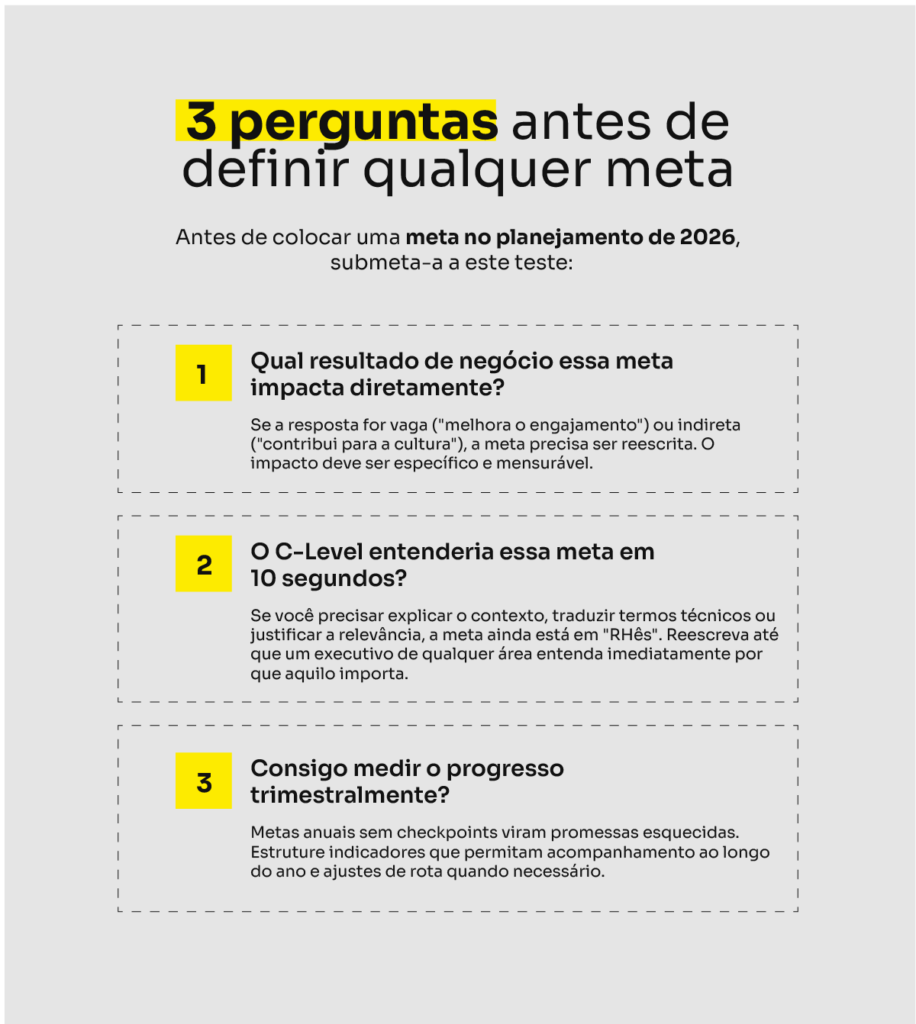 2026 oferece uma oportunidade de quebrar esse padrão. Mas isso exige mudar a forma como pensamos, estruturamos e comunicamos as metas de gestão de pessoas.