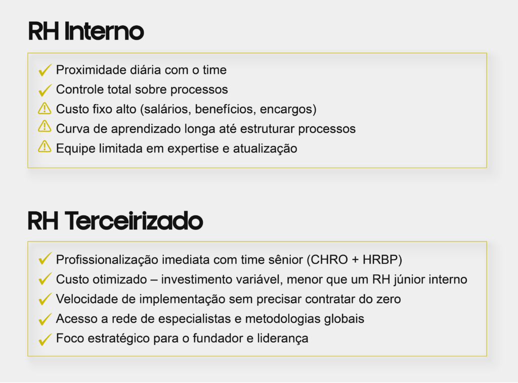 | Estrutura e Processos | Falta de clareza e processos de RH reativos (o “apagar incêndios”). | Implementação de processos de RH profissionais, ágeis e globais, adaptados à realidade local. O squad cuida do planejamento e implantação de todos os processos (cultura, comunicação, gestão de desempenho). | Redução de 30% no tempo gasto com burocracia e conflitos. |
